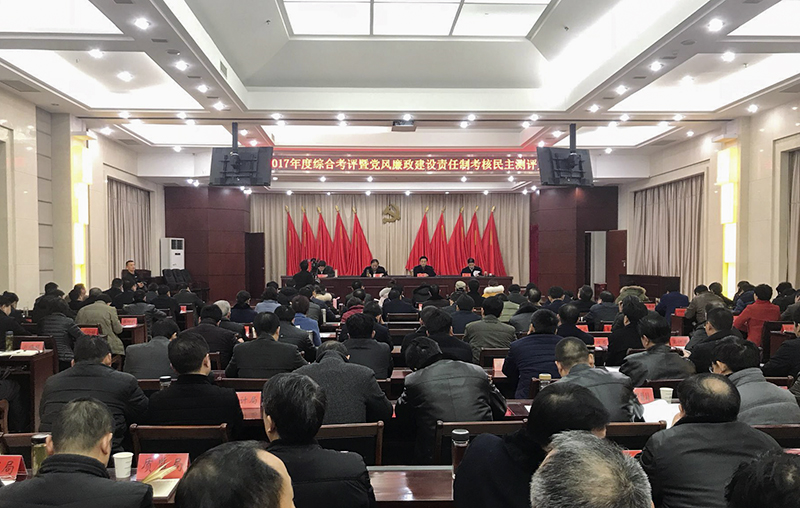 市委宣传部常务副部长曹荣葆、市纪委信访室主任腾骏代表考核组对我县落实党风廉政建设责任制工作进行了检查,全县组织召开了2017年度综合考评暨党风廉政建设责任制考核民主测评大会。132名与会人员对我县党政领导班子和领导干部政治表现、选人用人工作以及落实党风廉政建设责任制、作风状况等情况进行了民主测评。期间对县委主责办、城建局、九集镇落实党风廉政建设责任制情况进行了现场抽检,考核组重点查看了县委、县政府及相关单位主体责任全程纪实台帐。