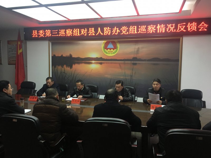 根据县委统一部署,2017年7月24日至2017年10月24日,县委第三巡察组对县人防办(地震局)党组进行了政治巡察。经县委巡察工作领导小组同意,12月15日,县委第三巡察组组长代先弘同志代表巡察组向县人防办(地震局)党组反馈了政治巡察情况,县委巡察办杨成忠同志就巡察整改工作提出要求,县人防办(地震局)党组书记、主任(局长)马乾才同志主持会议并作表态发言。