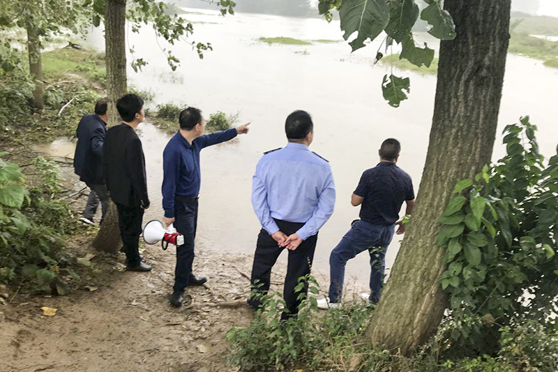 图为镇纪委书记王涛等检查防汛工作,并督促长渠打鱼人员立即上岸。